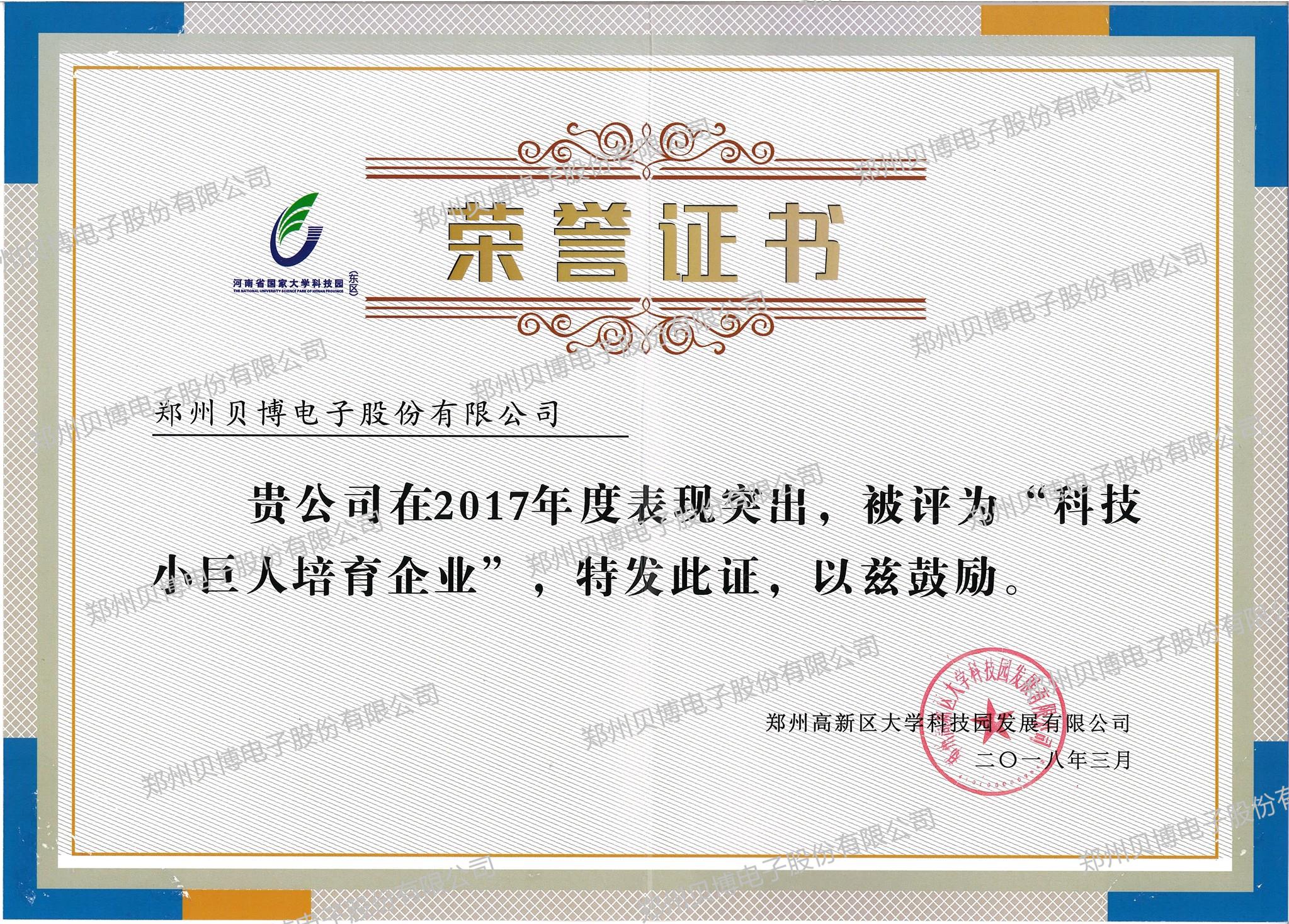 科技小巨人培育企業榮譽證書